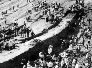 记得在挖河的日子里,村东的河床里万头攒动。由于那时根本没有机械化设备,一切全靠人力。工地上挖土的、推车的、抬筐的、挥锹的、筑堤的、打夯的,真个是红旗招展,口号震天,一派热火朝天的战斗景象。我们大王庄村包的地段南邻田二庄,北临青庄。开工头一天,村支书、大队长带领全村男女老少几百人齐上阵。四个生产队分工不分家,互相竞赛,互相协作,一个队指标完不成,其他队也不收工。大家每天忍饥挨饿,早出晚归,收工时都累的迈不动腿,但没有一个人说苦说累。因为大家都期盼着挖好大干渠,过上好日子,实现“誓让豫北变江南,家家吃上大米饭”(当时的口号)的梦想。