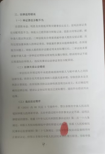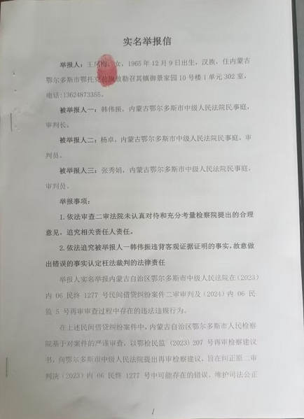 举报人实名举报内蒙古自治区鄂尔多斯市中级人民法院在(2023)内 06 民终 1277 号民间借贷纠纷案件二审审判及(2024)内 06 民监 5 号再审审查过程中存在的违法违规行为。
