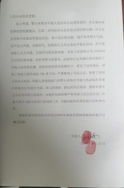 综上所述,鄂尔多斯市中级人民法院在处理本案时,未正确对待检察院的检察建议,且原二审判决存在没有质证的还款证据,经北京京安拓司法鉴定所鉴定结论,有6张还款收据,既不是举报人写的,也不是王凤莲、尤甜所写,经陕西正义司法鉴定所鉴定结论,亦不是举报人及王凤莲、尤甜所写的还款收据,另有2张供热公司4552910万元的收款收据,没有举报人的签名,法院却认定为谢巨荣还款给了举报人的收款收据,法院在没有质证的情况下,采信了这些伪证,导致了举报人损失高达700多万元,严重影响了司法公正,损害了举报人的合法权益。举报人恳请贵部门对鄂尔多斯市中级人民法院在本案中的相关行为进行全面、深入的调查,督促其纠正错误,重新审查并公正处理举报人的案件,以维护法律的尊严和举报人的合法权益。举报人将全力配合贵部门的调查工作,并随时提供所需的相关材料和信息。